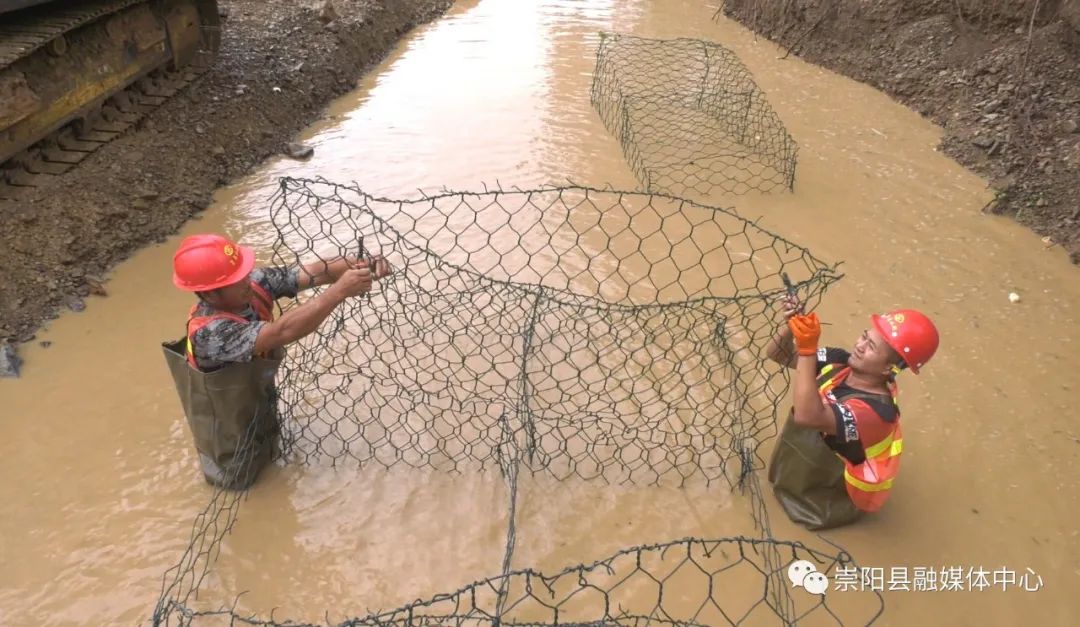 抢险现场,大型机械紧张作业,运输车辆来来往往,工人正在搬运格宾网、扎牢钢筋栅栏……县水利部门全力以赴尽快修复受损河堤,切实保障两岸群众生命财产安全。